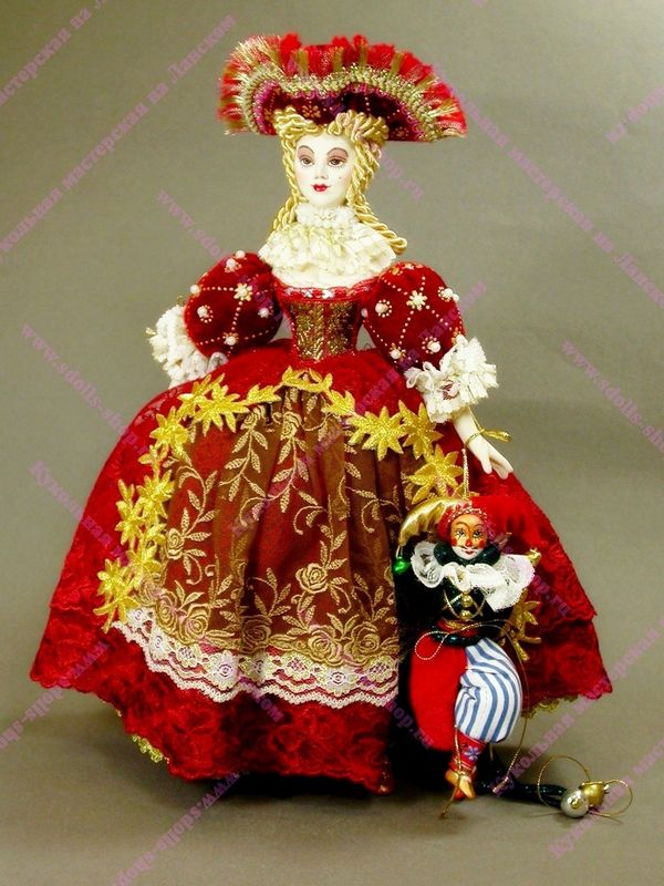 Интерьерная кукла – прекрасная дама в нарядном платье с куколкой-шутом....