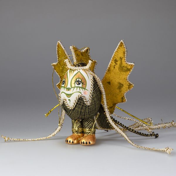 Елочная игрушка «Маленький дракон», созданная на основе фарфорового яйца, является оригинальным символом наступающего Нового года.