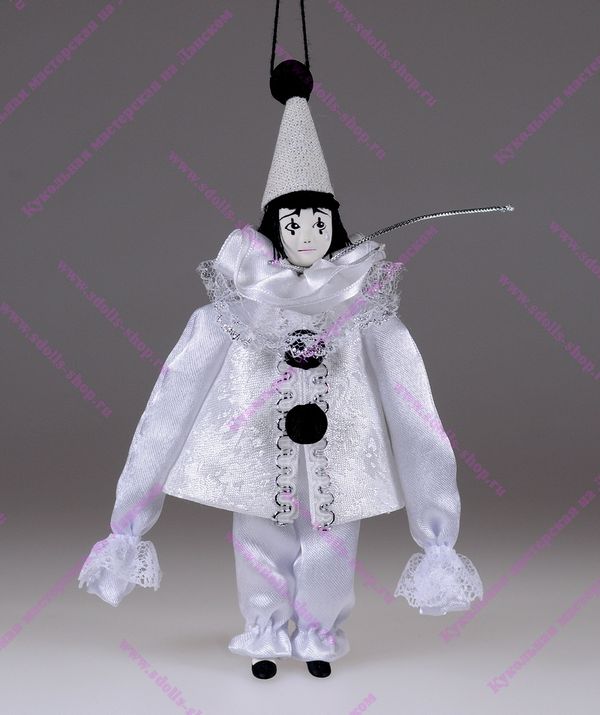 Подвесная елочная игрушка "Мальчик в костюме Пьеро" из серии "Дети в карнавальных костюмах" изготовлена вручную, тело текстильно-набивное, голова и ножки куклы выполнены из бисквитного фарфора.