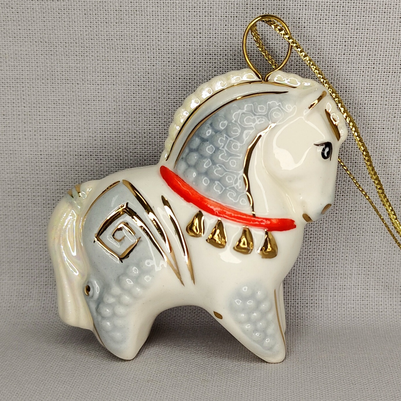Фарфоровая ёлочная игрушка Коник Богатырский. Имеет петельку для подвеса.