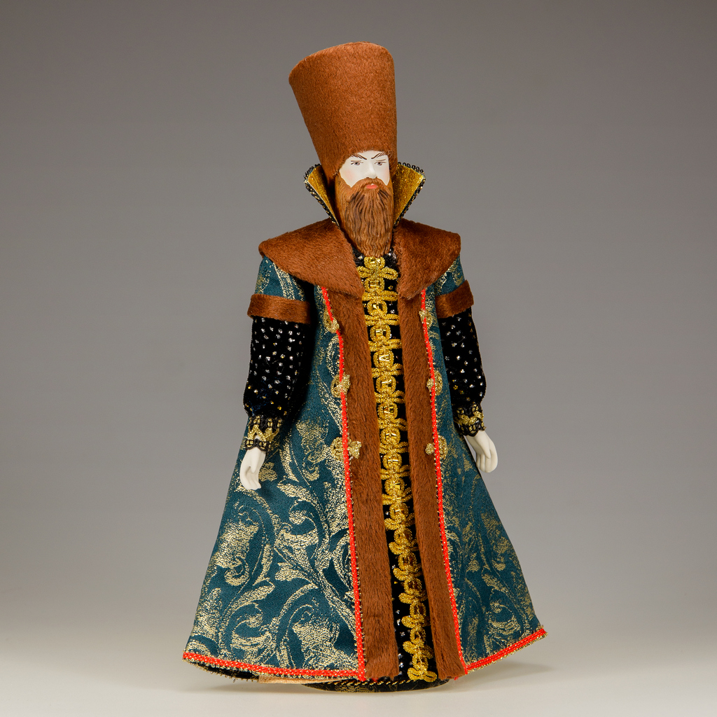 Мудрый боярин с окладистой бородой, в высокой меховой шапке и длиннополом парчовом кафтане с меховой отделкой.