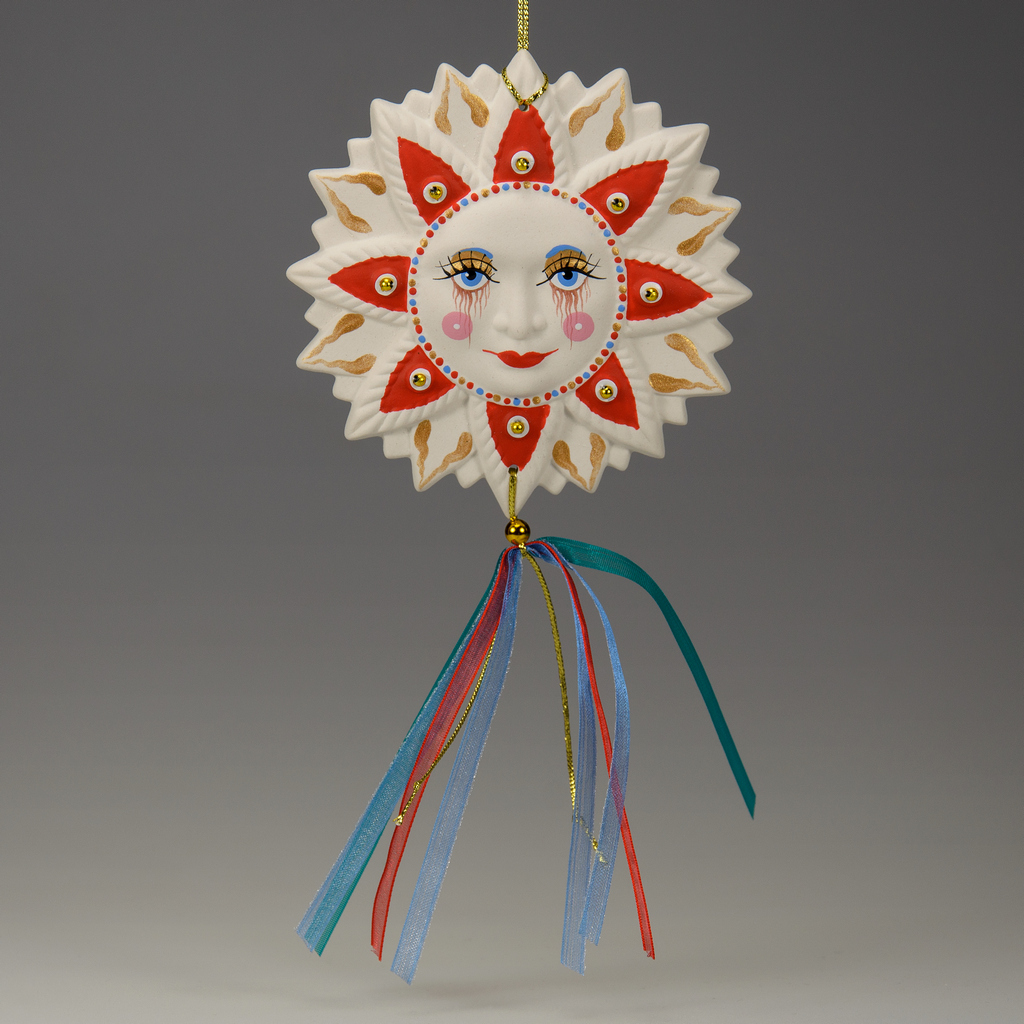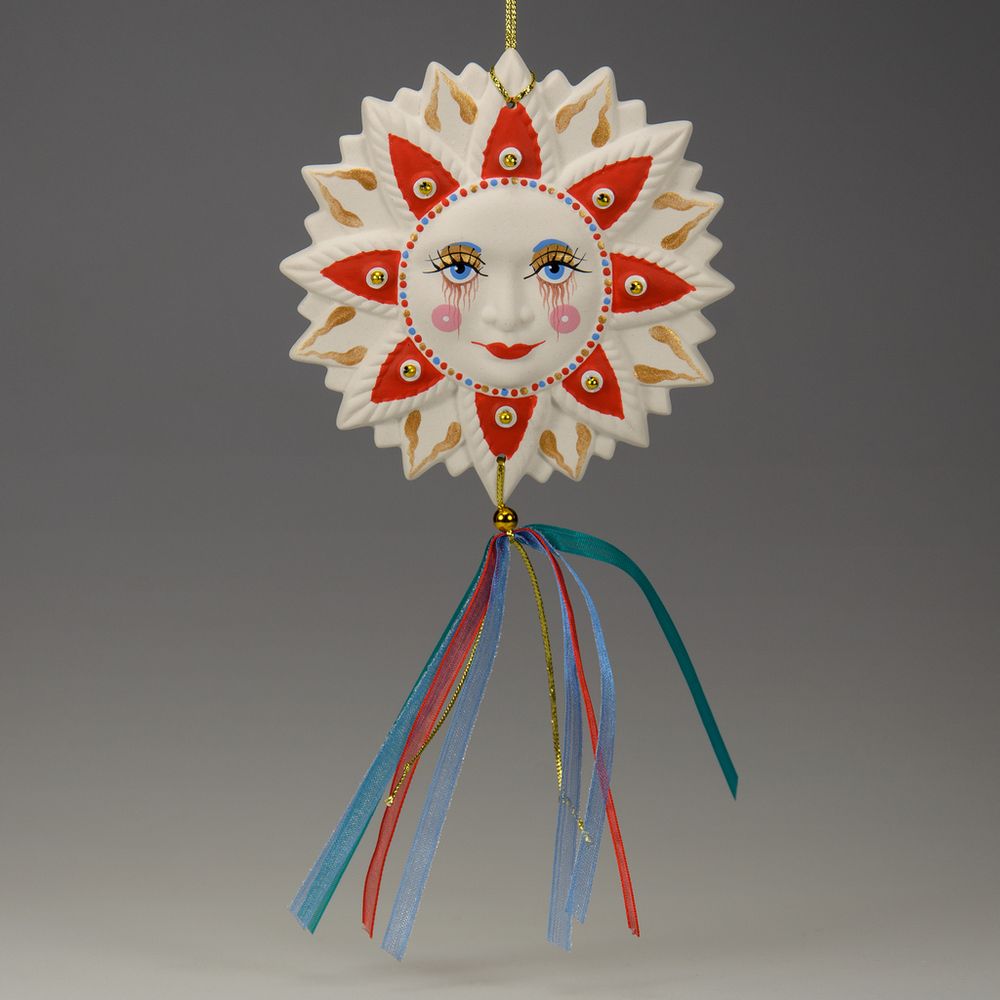 Оригинальная фарфоровая елочная плоская игрушка "Солнышко" будет прекрасным подарком или украшением новогодней елки.