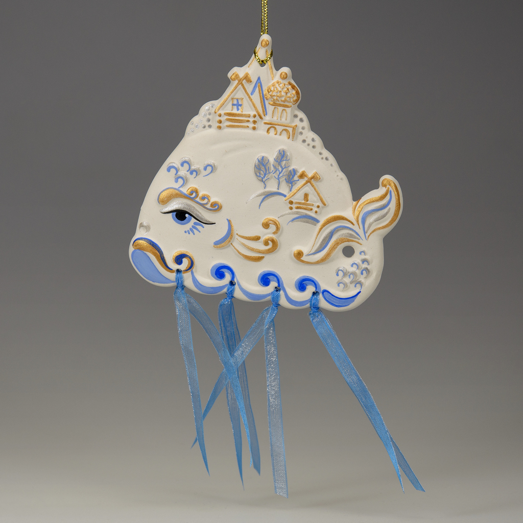 Оригинальная фарфоровая елочная плоская игрушка "Рыба-кит" будет прекрасным подарком или украшением новогодней елки.