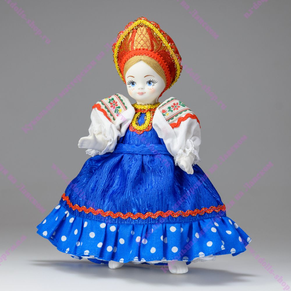 Небольшая куколка "Крестьянская девочка" с подвижными ручками и ножками станет отличным подарком, украсит интерьер. Кукла ручной работы в синем сарафане начнет или дополнит Вашу коллекцию.