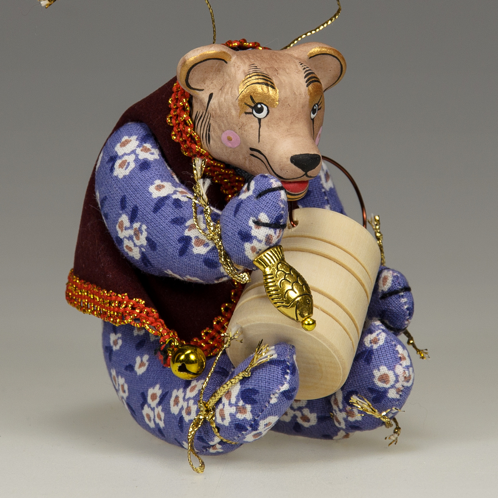 У подвесной игрушки текстильно-набивное тело с головой-маской из бисквитного фарфора. Роспись выполнена акриловыми красками.